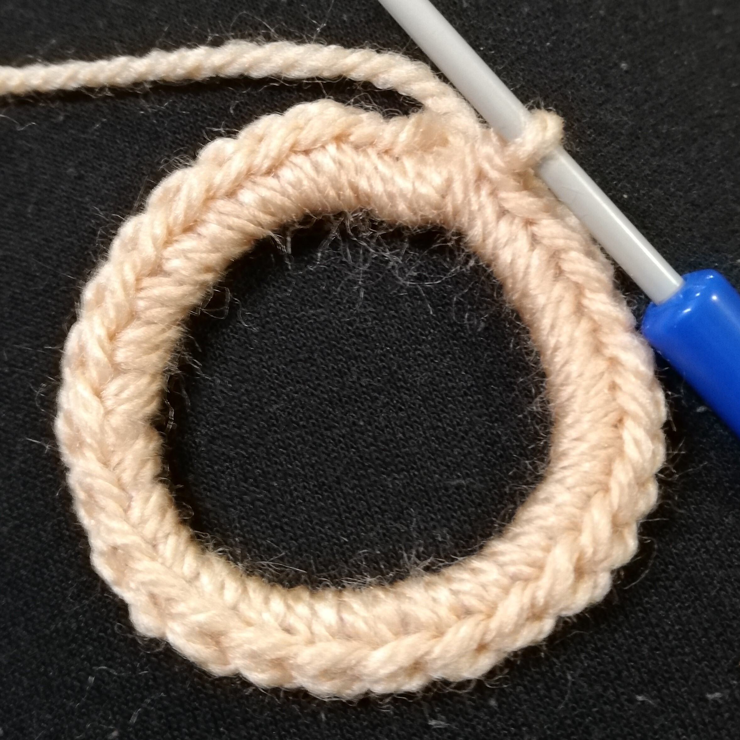A 4 különböző színű fonal valamelyikét használd. Spirálisan haladj körbe. Jelöld a sorok kezdetét egy darab fonallal.