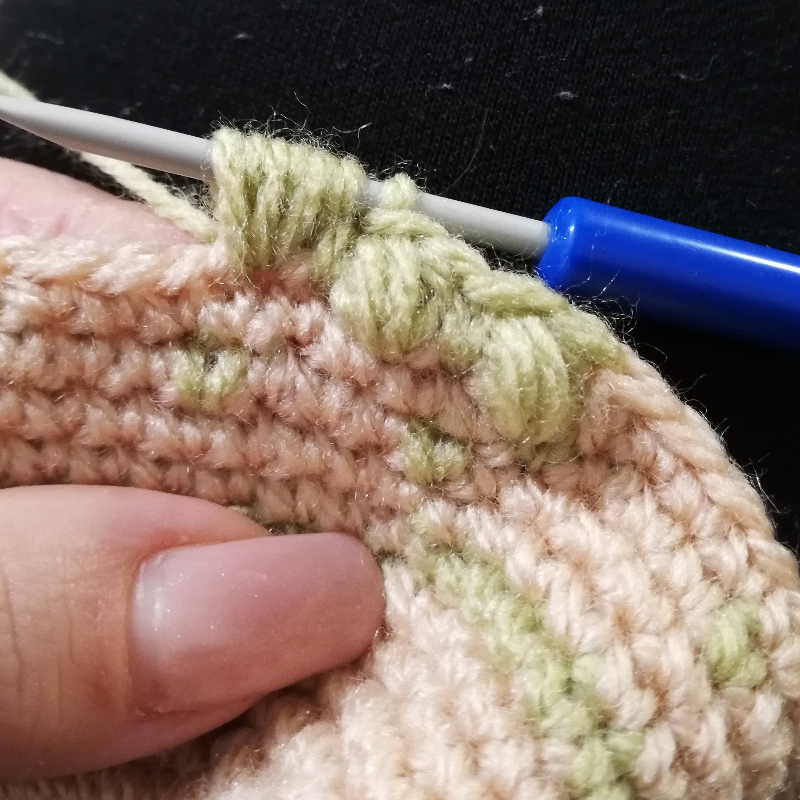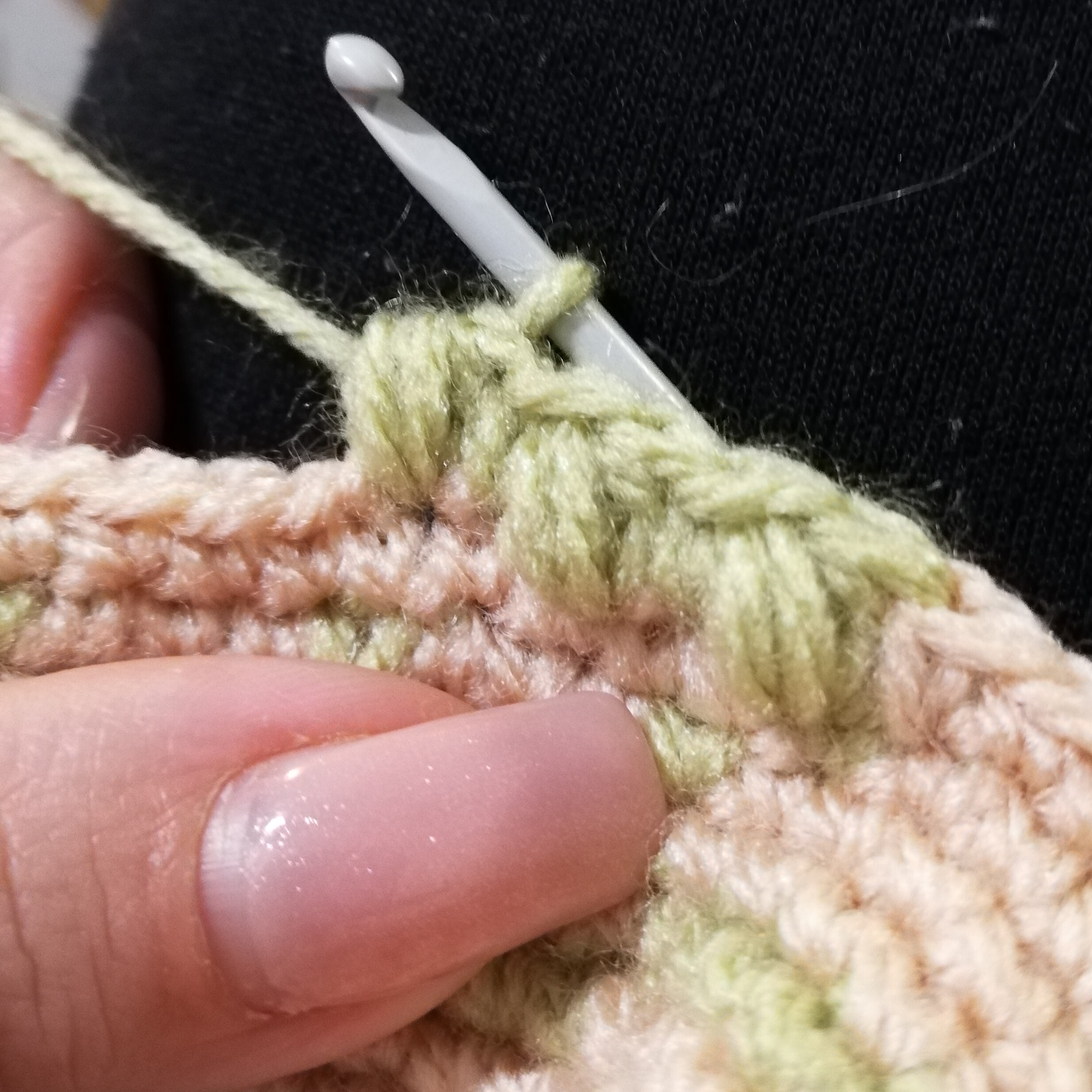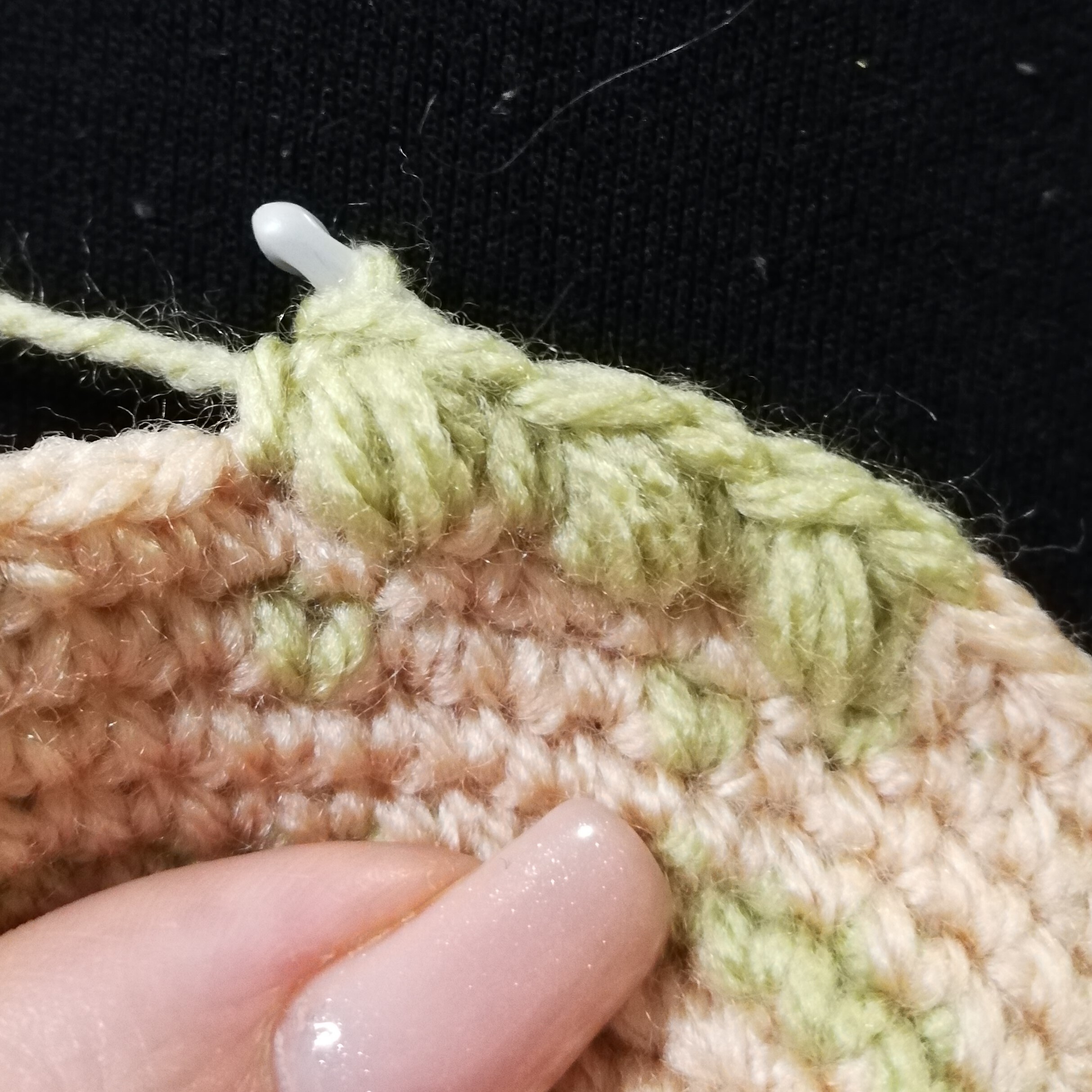 A pasztell rózsaszín és zöld fonalat használd. Spirálisan haladj körbe. Jelöld a sorok kezdetét egy darab fonallal.