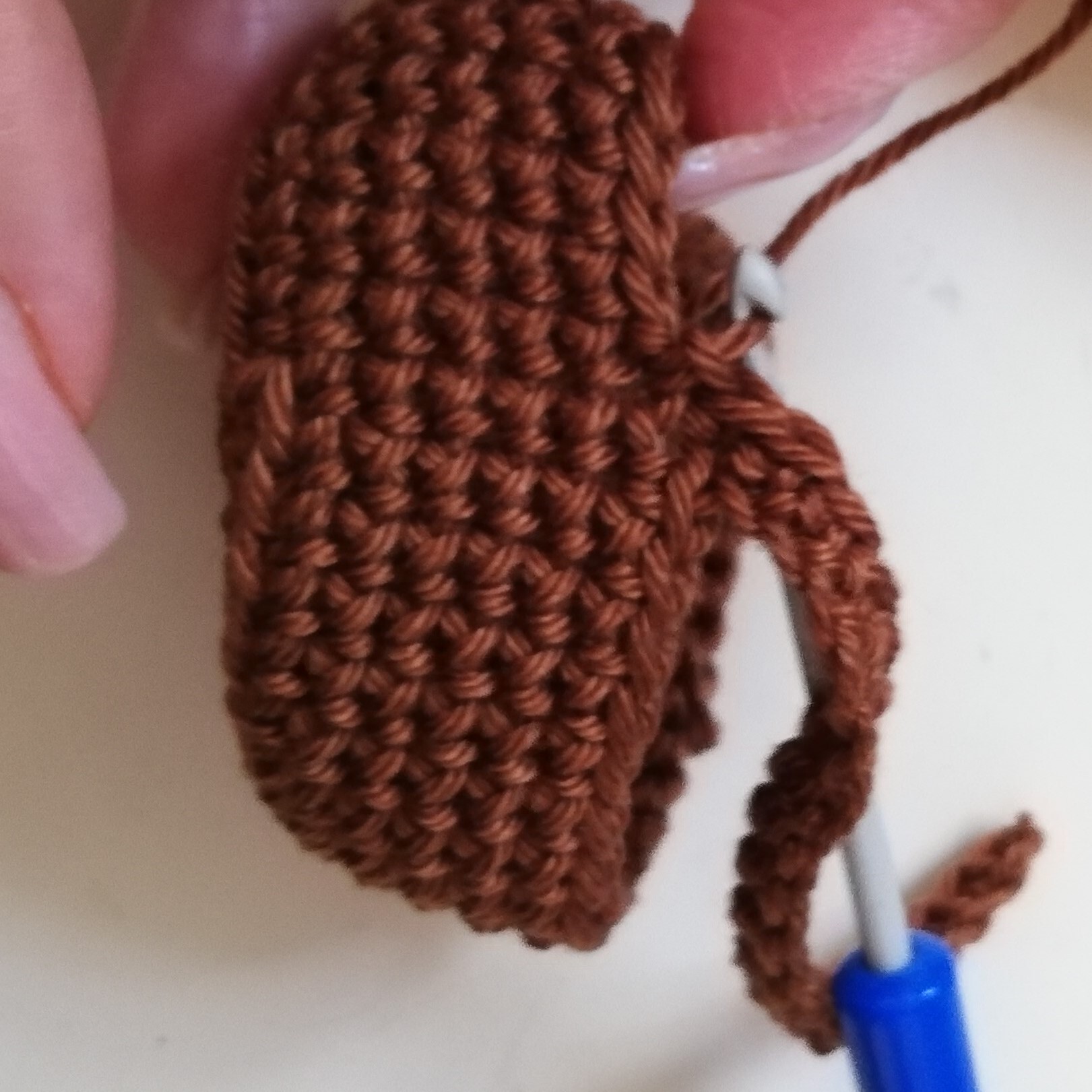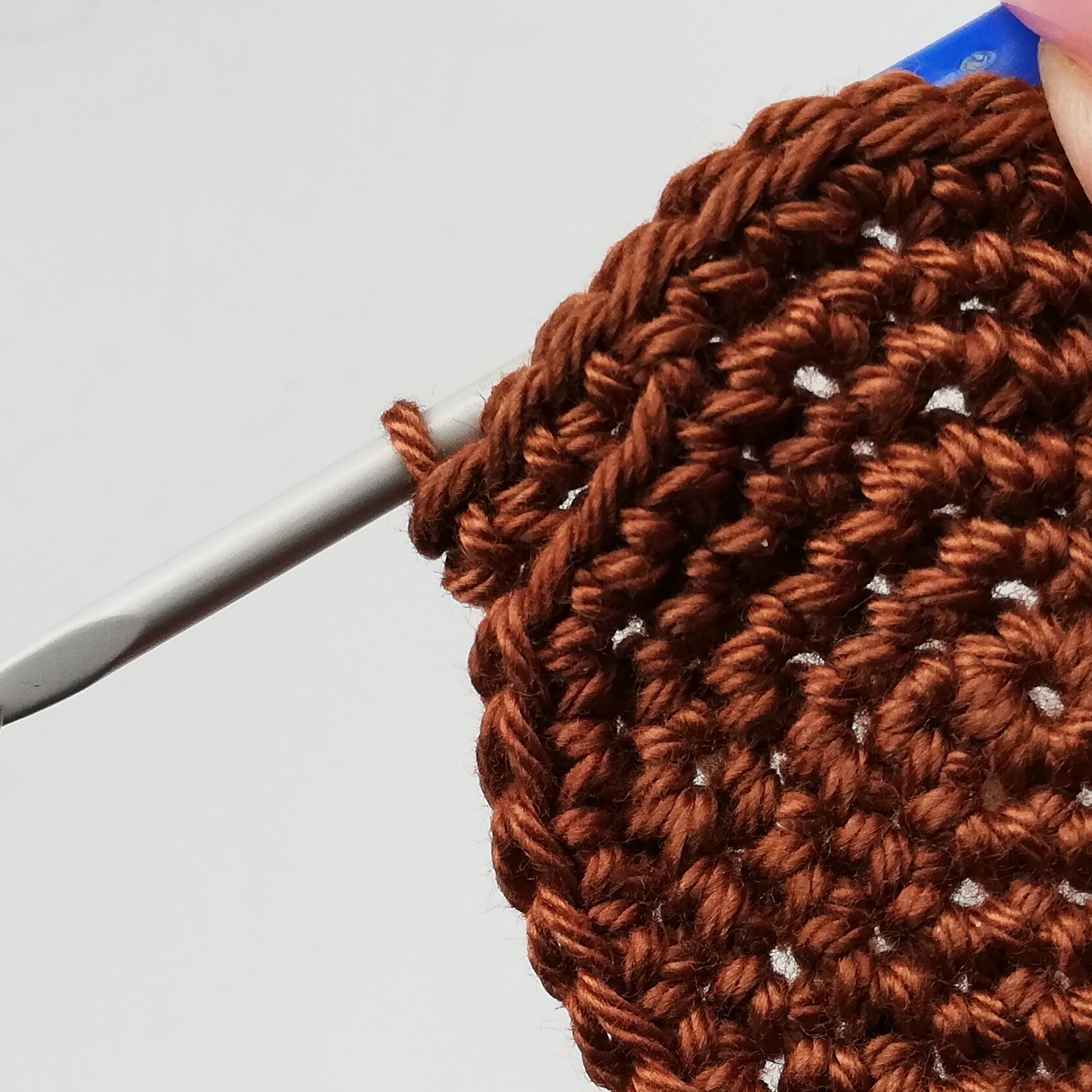 A barna fonalat használd. Spirálisan haladj körbe. Jelöld a sorok kezdetét egy darab fonallal.